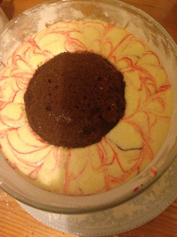 The chocolate core in marble coloured vanilla cake
